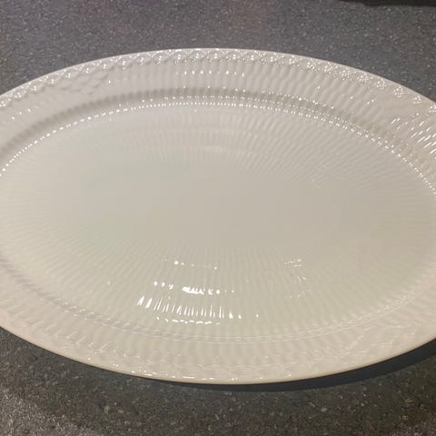 Royal Copenhagen oval fad i hvidt porcelæn. Fadet har en enkel og klassisk design med rillet kant. Velegnet til servering af forskellige retter.