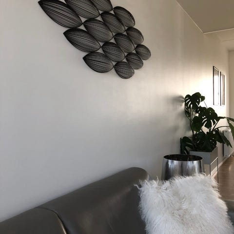 Metal vægdekoration med abstrakt design bestående af geometriske former i rustik finish. Dekorationen er monteret på noget canvas og er indrammet.