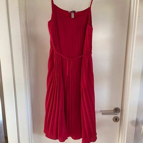 Slå-om-kjole med bindebånd, men syet om så den skal på over hovedet, er vist polyester men intet mærke, måler 107 cm (fra skulderen og ned), bryst ca 42x2 cm (målt under armene), aldrig brugt