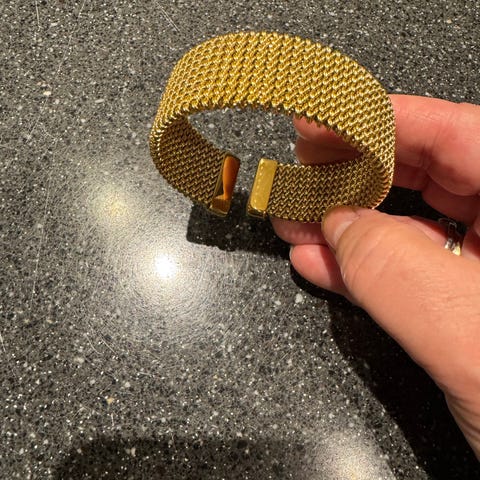 & Other Stories armbånd til kvinder, fremstillet i guld og andet materiale. Armbåndet har et dekorativt mønster med korslignende figurer og en tekstureret overflade. Designet er åbent, hvilket gør det justerbart og nemt at tage på og af. Jeg har brugt det selv til Tennisarmbånd. Må gerne komme og se det, og prøve det på.