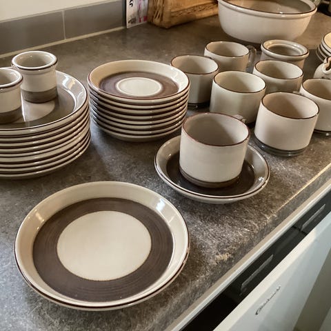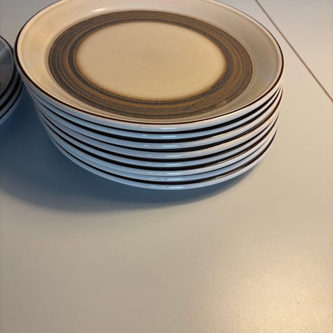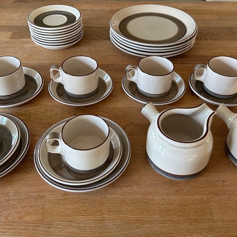 PERU Stoneware nr. 305 uden skår og fejl, har stået i et skab brugt få gange. Der er 12 stk, kaffekopper, 12 stk, underkopper 12 stk, side/kagetallerken 16 cm, de 12 stk, skåle er solgt 12 stk, middagstallerkninger 23 cm, et stk, tekande, ialt 49 stk, sælges samlet eller enkelt vis kr, 990