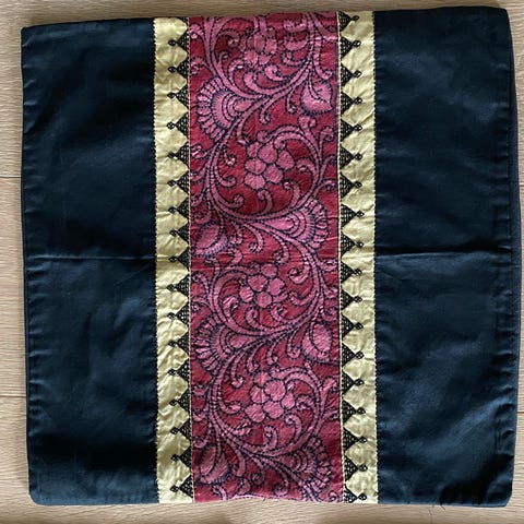3 fine, håndmalede pudebetræk af bomuld fra Indien. To af betrækkene har ens motiv. Stoffet er kraftigt bomuldsstof. De har aldrig været brugt. De er alle sammen åbne bagpå. Mål: ca. 40 x 40 cm.