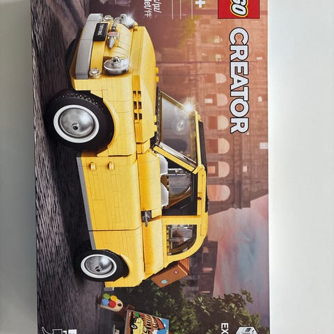 LEGO Creator Fiat 500 byggeklodser sæt med gule, sorte og grå klodser. Indeholder en byggevejledning til at samle en model af en Fiat 500 bil.