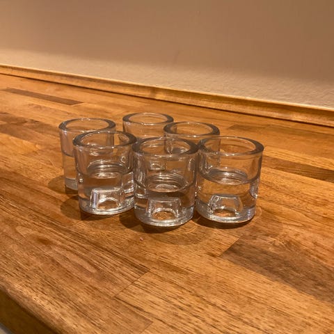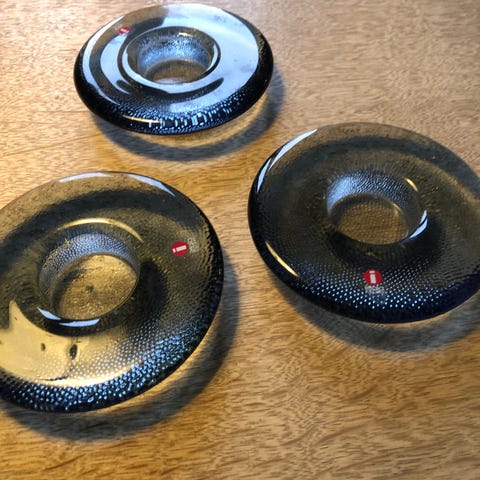 Iittala lysestager i glas med tekstureret overflade. Sættet indeholder flere lysestager i forskellige størrelser, velegnet til brug med almindelige stearinlys. Designet til dekoration og belysning i hjemmet.