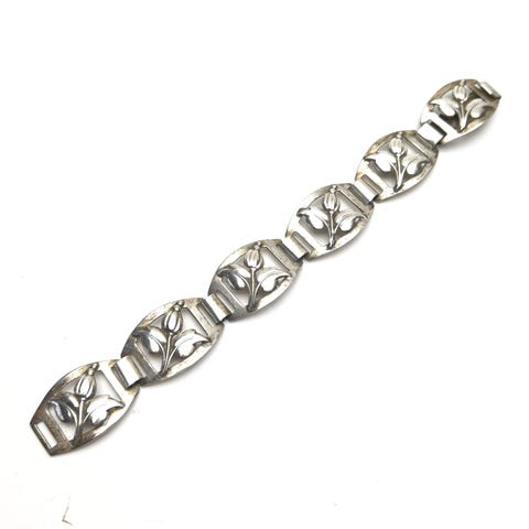 Charmerende sølv armbånd med fine kirsebærgrene med bær. Antikt fra ca 1899-1925. Designet af juveler C Holm. Virksom i Kbh 1893-1925. Længde 19cm x 1cm. Vægt 25gram. Smuk stand. Hægte lukke.