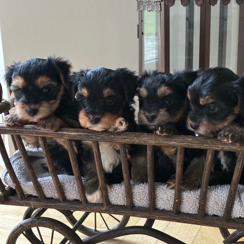 Begge forældre haves og kan ses ved besøg. Mor er meget lille Yorkshire Terrier og far er Coton de Tulear (bomuldshund).