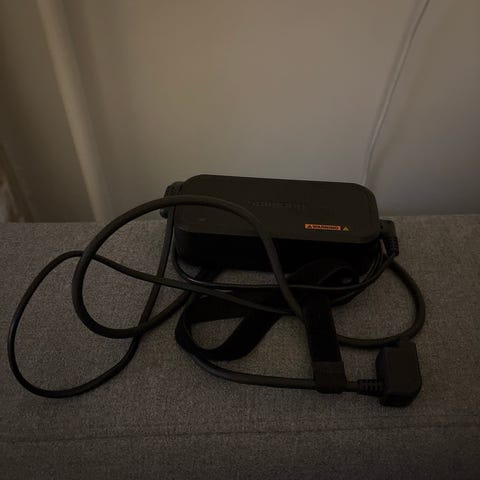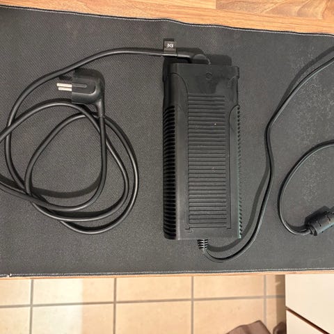 Orange netadapter i sort farve med kabel. Anvendes til strømforsyning af kompatible elektroniske enheder. Primært til el-cykel.