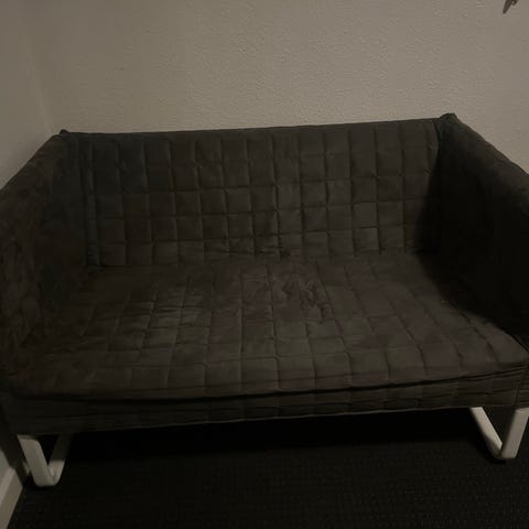 Topersoners sofa. Det eneste den fejler er at syningen er gået lidt i den ene pude. Det kan ses på sidste billede.