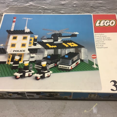 Stort LEGO City politistation med tilhørende politibiler, motorcykler, ATV og politibåde. Sættet indeholder flere figurer og detaljerede bygninger.