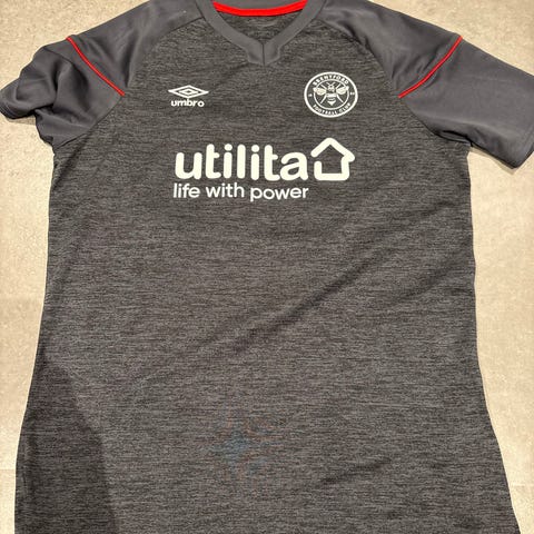 Umbro Luton Town Fodboldtrøje i størrelse S til mænd. Trøjen har en farvekombination af sort, rød og blå med tryk på ryggen med navnet 'ADEBAYO' og nummer 11.
