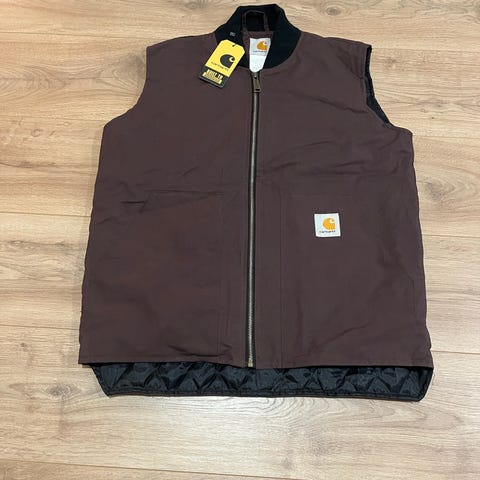 Carhartt vest i dun, størrelse S, til herre. Vesten er blå og designet til udendørs brug med isolerende materiale for ekstra varme.