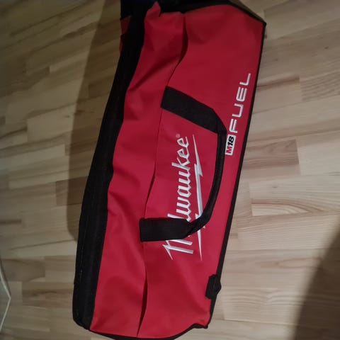 Milwaukee Packout værktøjstaske i rød og sort farve med flere lommer og rum til opbevaring af værktøj og tilbehør. Tasken har et robust håndtag og lynlåslomme til ekstra opbevaring.