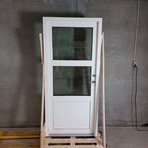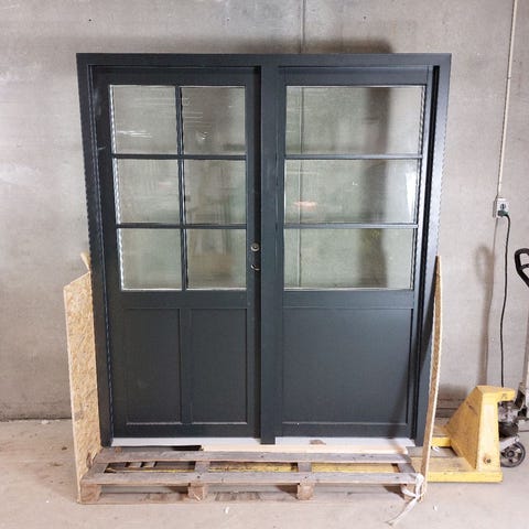 Facadedør med sideparti i træ/alu med 3-lags satin matte energiruder, hårdttræsbundstykke og 3-punktslås. Nøgler og greb medfølger løst.