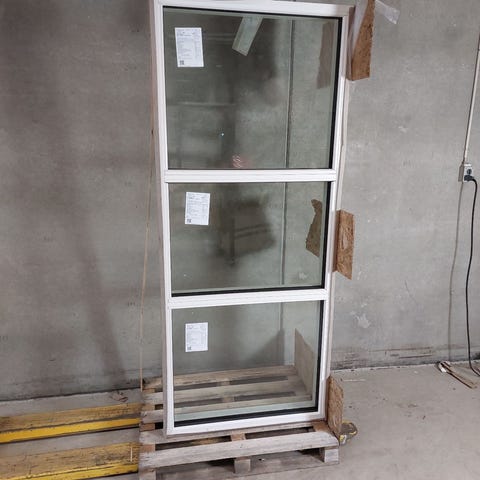 Udestueelement i træ/alu med 3-lags energiruder. Fyldning nederst, sidehængt rude i midten og fast rude øverst. Har overfladeridser og er meget beskidt.