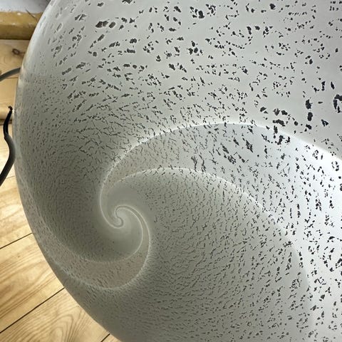 Smuk vintage loftslampe/pendel i glas og krom/stål. Den er fra omkring 1930’erne, smukkeste hvide glas der giver et flot hyggeligt lys uden at blende.