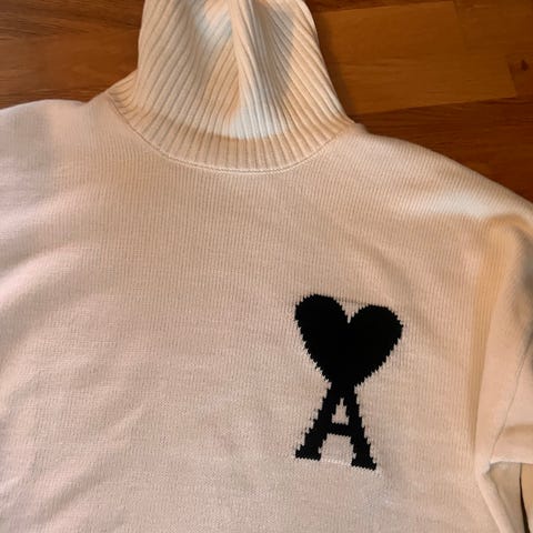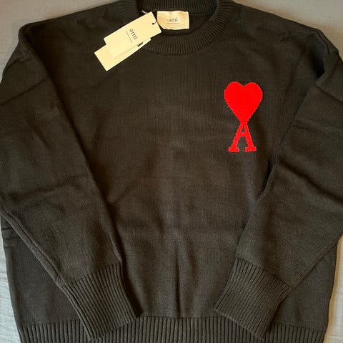 Ami M striktrøje i blå farve til herre. Trøjen har rund hals og er fremstillet i strikket materiale. Den har et hjerte-logo på brystet.(varen er ikke fra Ami Paris)