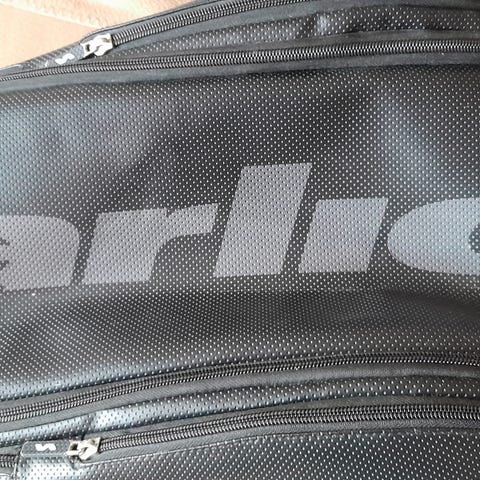 Sort med hvid skrift. Har plads til flere, med beskyttelse og to remme, så den kan bæres som rygsæk. Foret er gået lidt fra indvendigt, men ellers er den så god som ny.