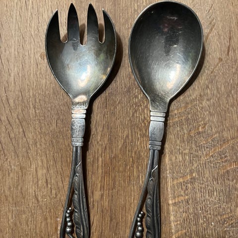 Georg Jensen nr 141. sæt bestående af en ske og gaffel i sterling sølv med dekorative håndtag.