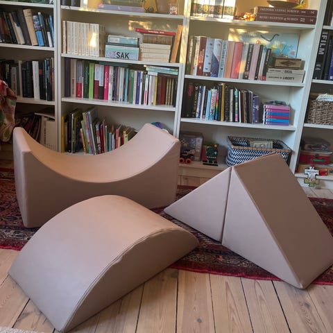Som "Bro" (Flad side ned): Børnene kan kravle over den ("bjerget") eller sidde på den som en hest/bænk.