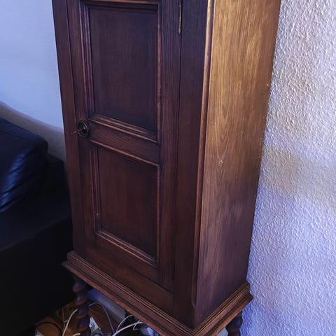 Antikt vitrineskab i træ med glaslåger og flere opbevaringsrum. Skabet har en nedklappelig låge. Udført i egetræ. Svenskrødt indre.