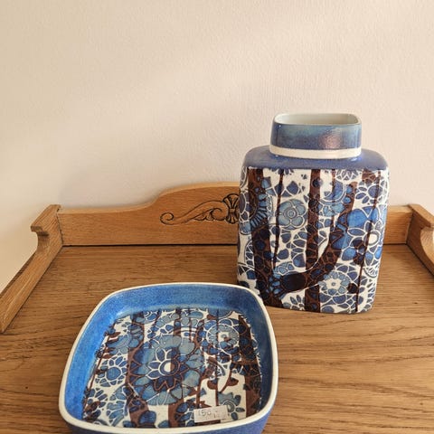 Baca Fajance skål/fad med blå dekoration af Marianne Johanson.