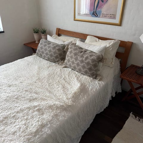 dejlig dobbeltseng der fremstår som ny er kun 1 år gammel og ingen brugsspor. Medfølger topmadras og sengegavl. bud modtages gerne.
