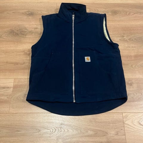Carhartt Vest i brun farve, størrelse S til mænd. Fremstillet i bomuld med quiltet foring, designet til udendørs brug. Vesten har lynlåslukning og er egnet til lag-på-lag påklædning.
