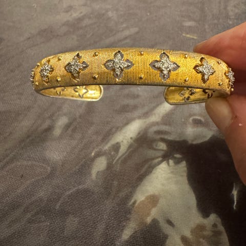 Bredt guld armbånd til kvinde i forgyldt materiale med detaljer som ses på foto. Har fået det i gave.