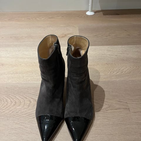 Flot Lujans italiensk højhælet kort støvle i grå ruskind med sort ruskind snude.