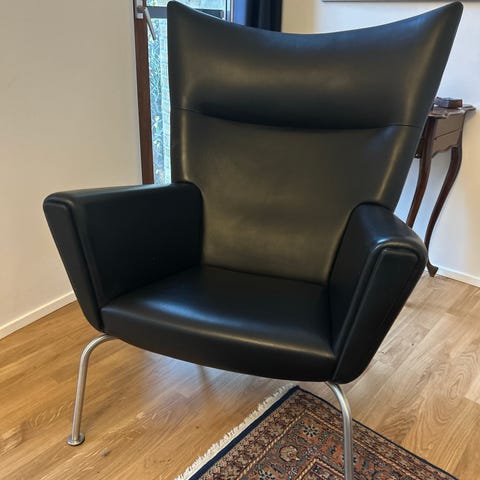 Sort læder Wing Chair med nakke pude og med rund læder puf købt hos Roskilde møbelpolstrer , står som nyt