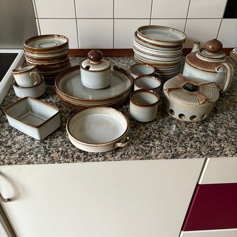 Søholm Steingods/Sonja testellet keramik service sæt bestående af 6 kopper, 6 tallerkener, 1 lysestage, 4 små smørskåle, 1 tekande og 1 skål med låg til smør. Fremstillet i stentøj med en brun og beige farvetone. I virkelig god stand.