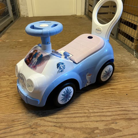 Hjulene kan vippes op, så den både kan bruges som gå-vogn og gyngehest. Se de sidste to billeder.