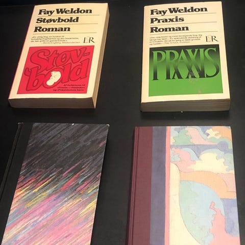 Støvbold, Fay Weldon, genre: humor, Om et ungt London-ægtepar, der realiserer drømmen om det lille hus på landet, hvor hun bliver gravid. Nabokonen, der går for at være en heks, driver sit spil mod moder og barn