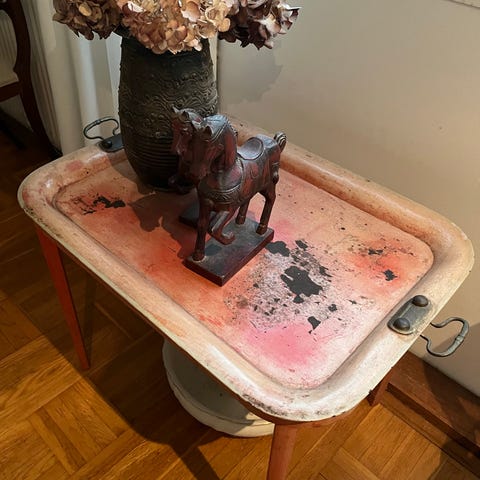 Sammenklappelig bakkebord i metal og plast, fra 1960erne.