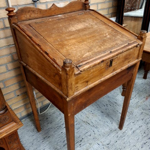 Produktet er en skrivepult i træ med flere skuffer og en nedfældelig skriveflade. Den har en rustik overflade.,Afhentes i:,Røde Kors Bellinge (461),Bemærk at mail, chat og beskeder ikke besvares, og varen skal købes på knappen "Gå til varen"