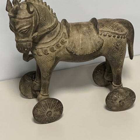 Det karakteristiske er de aftagelige eller separat fremstillede elementer (halen, sadelplader), hvilket antyder en høj kvalitet i fremstillingen. Åbningen i ryggen antyder, at objektet oprindeligt blev brugt som rygekar eller vase.