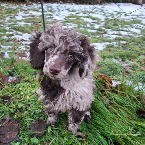 Han er 11 uger, og er en utrolig sød og charmerende puddel med et helt unikt udseende – han er en super lækker chokolade brun fyr, som bare er super energisk og glad hver dag!