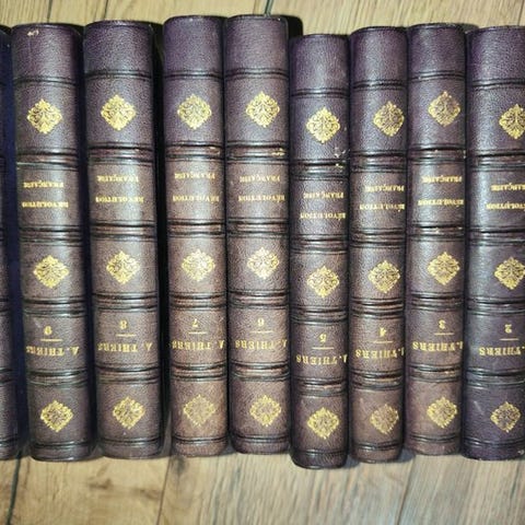 En ti bind, bevaret i fuldt skindindbindings med prikket basane, glatte rygge prydet med fleurons og små guldjern, titel- og volumenmærker i rødt læder og guldletter, fillets, røde kanter. I god stand overordnet set. Skindet er slidt ved snit, hjørner, rygbånd, uden alvorlige skader. Omhyggelig tryk på håndgjort papir, let gulnet papir med spredte rødder