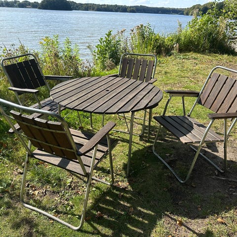 Lækkert café Sæt i Aluminium 2 stole og et bord 72 h 60 dia 900kr.. Træ have sæt 4 klapsammen stole 1 rundt bord 1600kr.