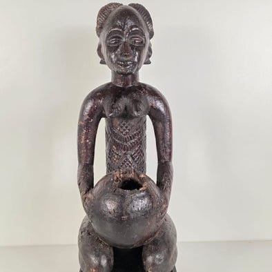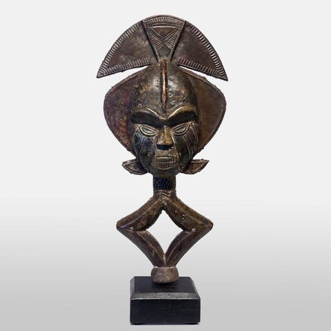 Doppelkrug Mangbetu, et træartefakt fra DR Kongo af Mangbetu-efternavn, dateret til midten af det 20. århundrede, 31 cm bred, 14 cm dyb, 26 cm høj, vejer 1420 g, i god stand, provenance privat samling, 1 enhed, solgt uden stand, original og sjælden udgave. Klik på den blå "gå til varen" knap, for at købe eller byde på denne vare. Den samlede pris vil blive vist inden du afgiver dit bud.