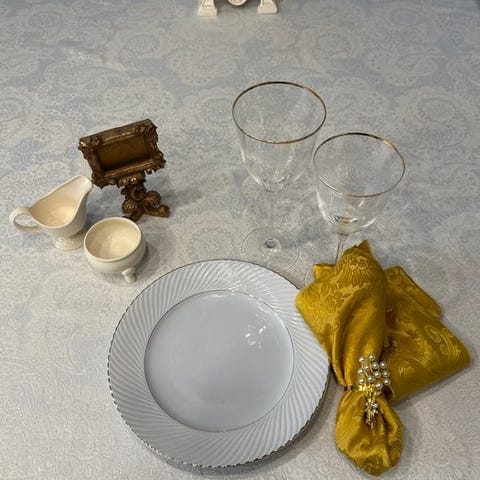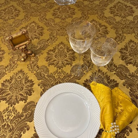 Forsiden udført i satin i lyst champagneguld og ramagedekorationer med orientalske viburnum-blomster, kaldet snøball, broderet i relief i nuancer af guld og elfenben på grene i kontrast brun bronze over hele feltet til en fortryllende tredimensionel effekt, sofistikeret, lysende og solrig, yderst dekorativ
