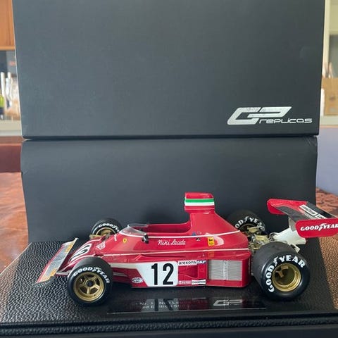GP Replicas die-cast Ferrari 312 T2 Niki Lauda 1977 i rød, fra perioden 1970–1980, som nyt, begrænset til 500 eksemplarer, i original emballage. Klik på den blå "gå til varen" knap, for at købe eller byde på denne vare. Den samlede pris vil blive vist inden du afgiver dit bud.