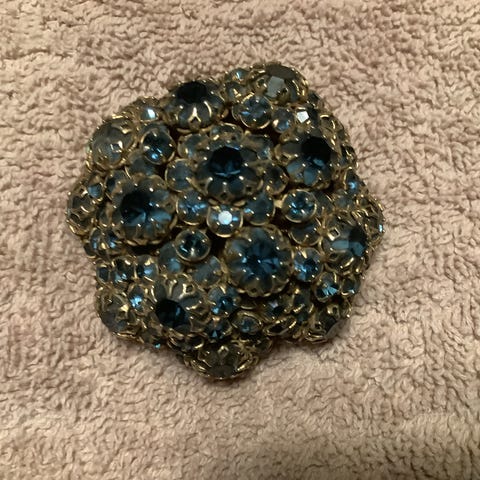 Sølvfarvet metal med blå Lucite-elementer og krystal-strasssten.