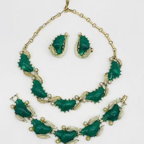 Louis Kramer New York 4-delt paruresæt fra USA, sølvfarvet metal med blå Lucite-elementer og krystalstrasse, inkluderer halskæde, armbånd, øreringe og brosje; samlet vægt 147 g; tilstand: fremragende. Klik på den blå "gå til varen" knap, for at købe eller byde på denne vare. Den samlede pris vil blive vist inden du afgiver dit bud.