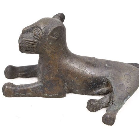 Leopardfigur i ben i benin, med keramiske og metaldele, oprindelig fra Benin og forbundet med Benins kongelige symbolik, provenance fra en gammel samling omkring 1900, målene er 32 cm i højden, 13 cm i bredden, 52 cm i dybden, vægt 5,71 kg. Klik på den blå "gå til varen" knap, for at købe eller byde på denne vare. Den samlede pris vil blive vist inden du afgiver dit bud.