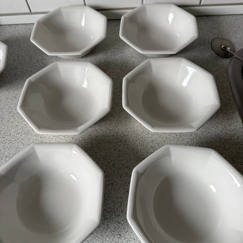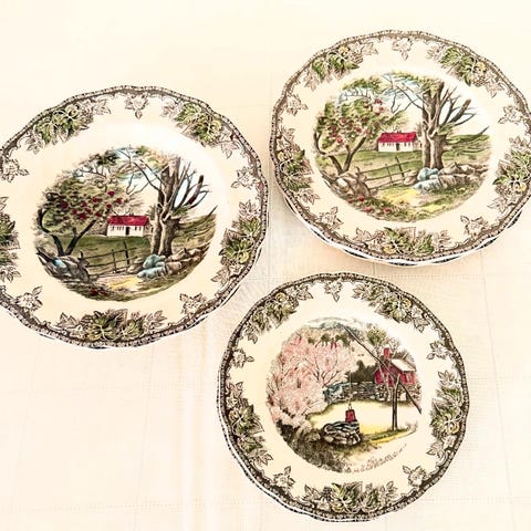 JOHNSON BROS, Maison Royal d'Angleterre - Fabelagtigt service sæt - af service tallerkener fra The Friendly Village af Johnson Brothers, produceret i England. Bordets kunst - eksklusiv mat porcelæn i ultra-hvid tone med detaljerede og realistiske mønstre af forskellige scener med landskaber, fantastisk spejlglans! - I fremragende stand uden brud!