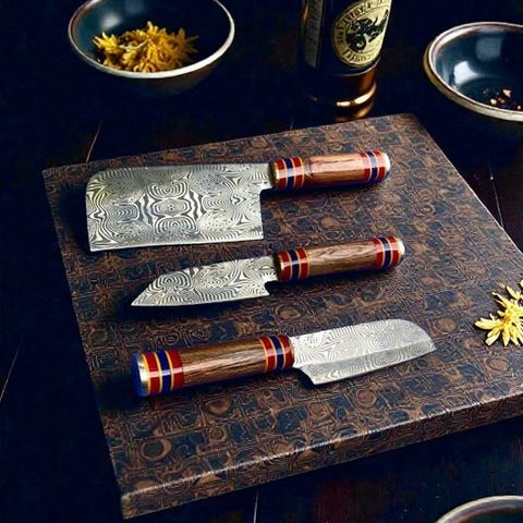 Vi er begejstrede for at præsentere et eksklusivt sæt på FIRE håndlavede japanske stilknive fra en verdensberømt professionel samling—et must-have for kokke, samlere og udendørsentusiaster! Disse specialsmidede blade, omhyggeligt fremstillet med stor omhu, kombinerer tidløs kunsthåndværk med enestående ydeevne, hvilket gør dem til et værdifuldt tilskud til ethvert kongeligt køkken eller campingudstyr. Hvorfor disse knive skiller sig ud: Elitehåndværk: Smidt af Shirogami Old og dobbeltpoleret stål, kendt for sin enestående hårdhed (HRC 52 til 57) og ekstrem skarp kant. Disse blade leverer præcisionsskæring og langvarig holdbarhed til enhver opgave, fra delikat skæring til robust udendørs hakning.