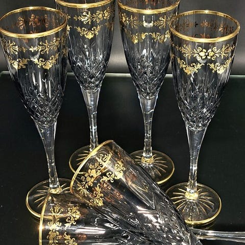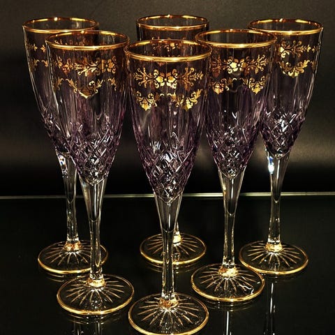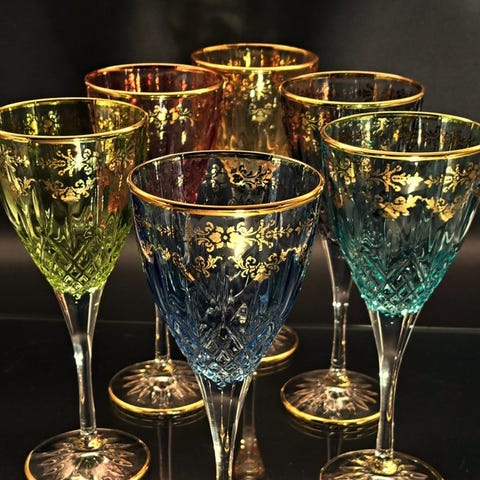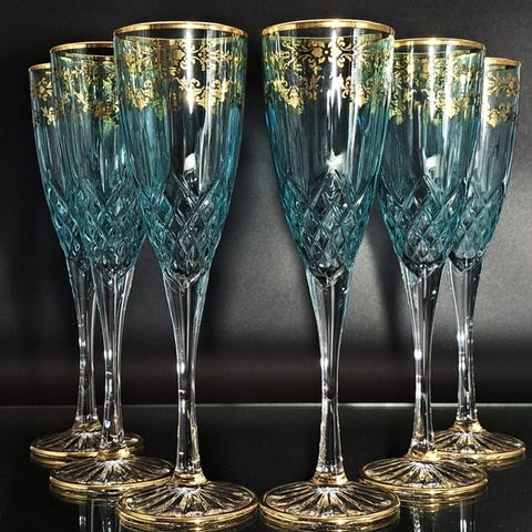 Artemisia: 6 højkvalitets krystalvinsglas dekoreret med blondereffekt, i 24 karat guld i azurblå farve.