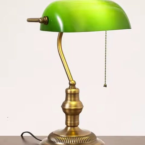 Smuk bankierslampe med grøn glas skærm (ingen plastik) og messing-look fod. Denne notarislamp er inspireret af og reproduktion af den klassiske notarislamp. Lampen har en lille fatning. Fremstår i fremragende stand, med fungerende belysning.