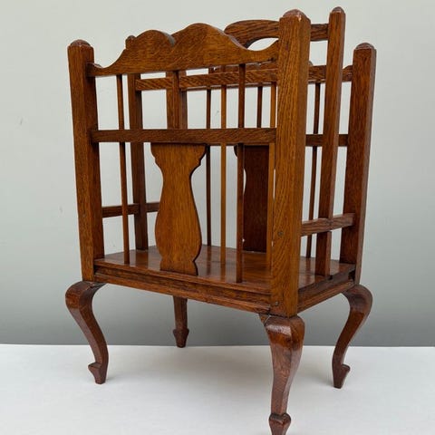 Antik fritstående træjournal-/læsebak fra Storbritannien med rundtfyldt flettet rattanpaneler, dateret ca. 1900–1925, mål ca. 50 cm bred × 40 cm dyb × 35 cm høj, vægt 2 kg, i god stand med små tegn på ælde og pletter, mærket Lektuurbak. Klik på den blå "gå til varen" knap, for at købe eller byde på denne vare. Den samlede pris vil blive vist inden du afgiver dit bud.
